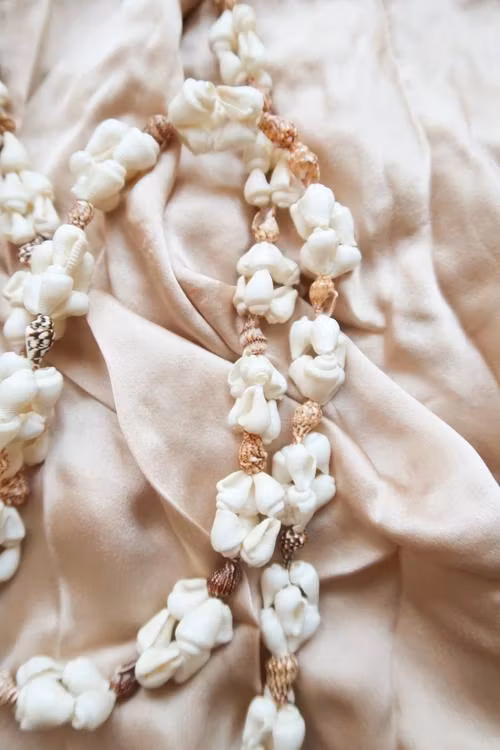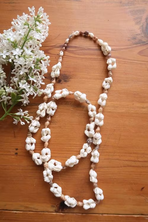 Snäckhalsband med vita & bruna snäckor.