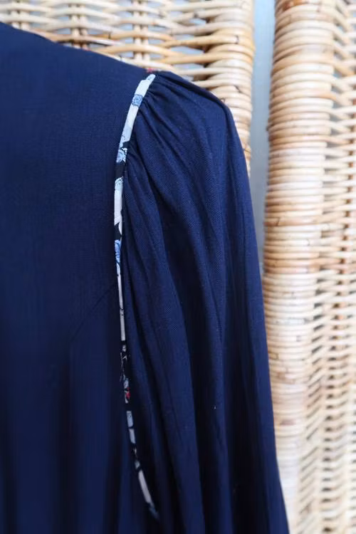 Blå klänning med blommiga detaljer & axelvaddar.