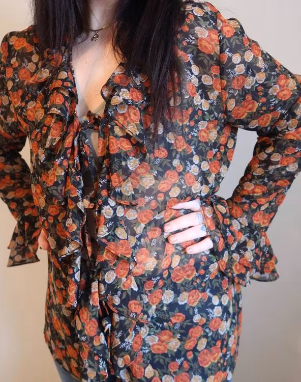Blommig skir blus med volanger.