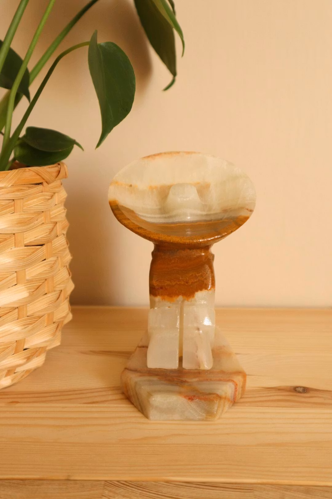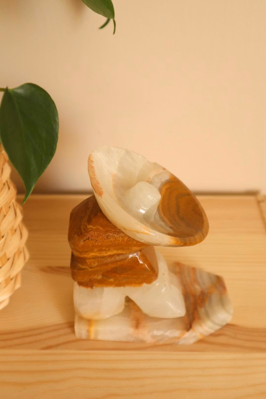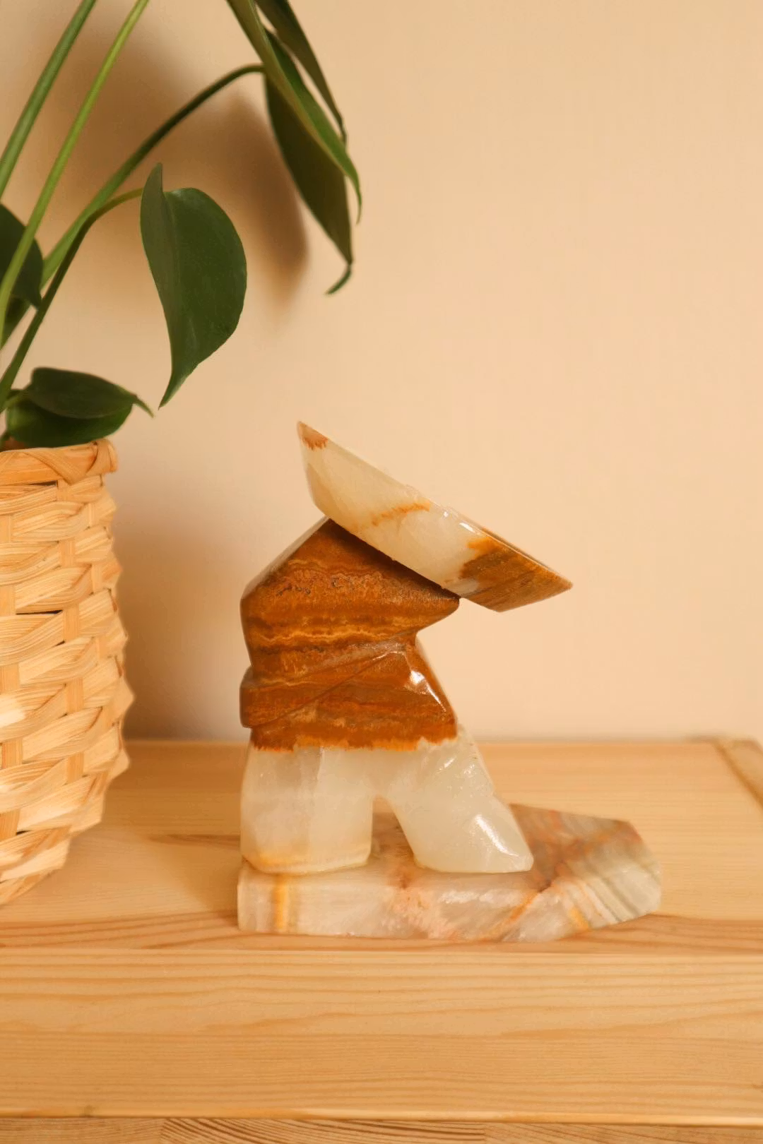 Ett bokstöd i sten i form av gubbe som lutar sig mot en kaktus.
