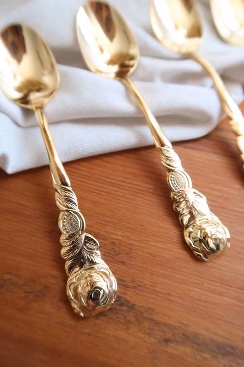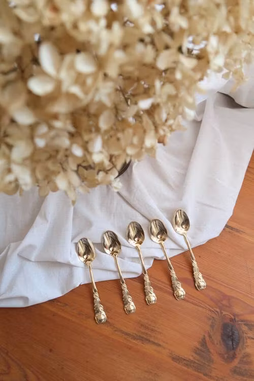 Fem små guldiga skedar.