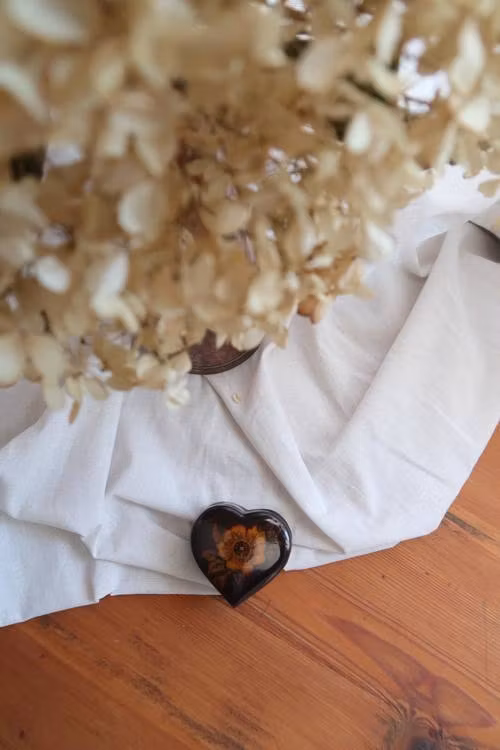 Liten brun ask med blomma.