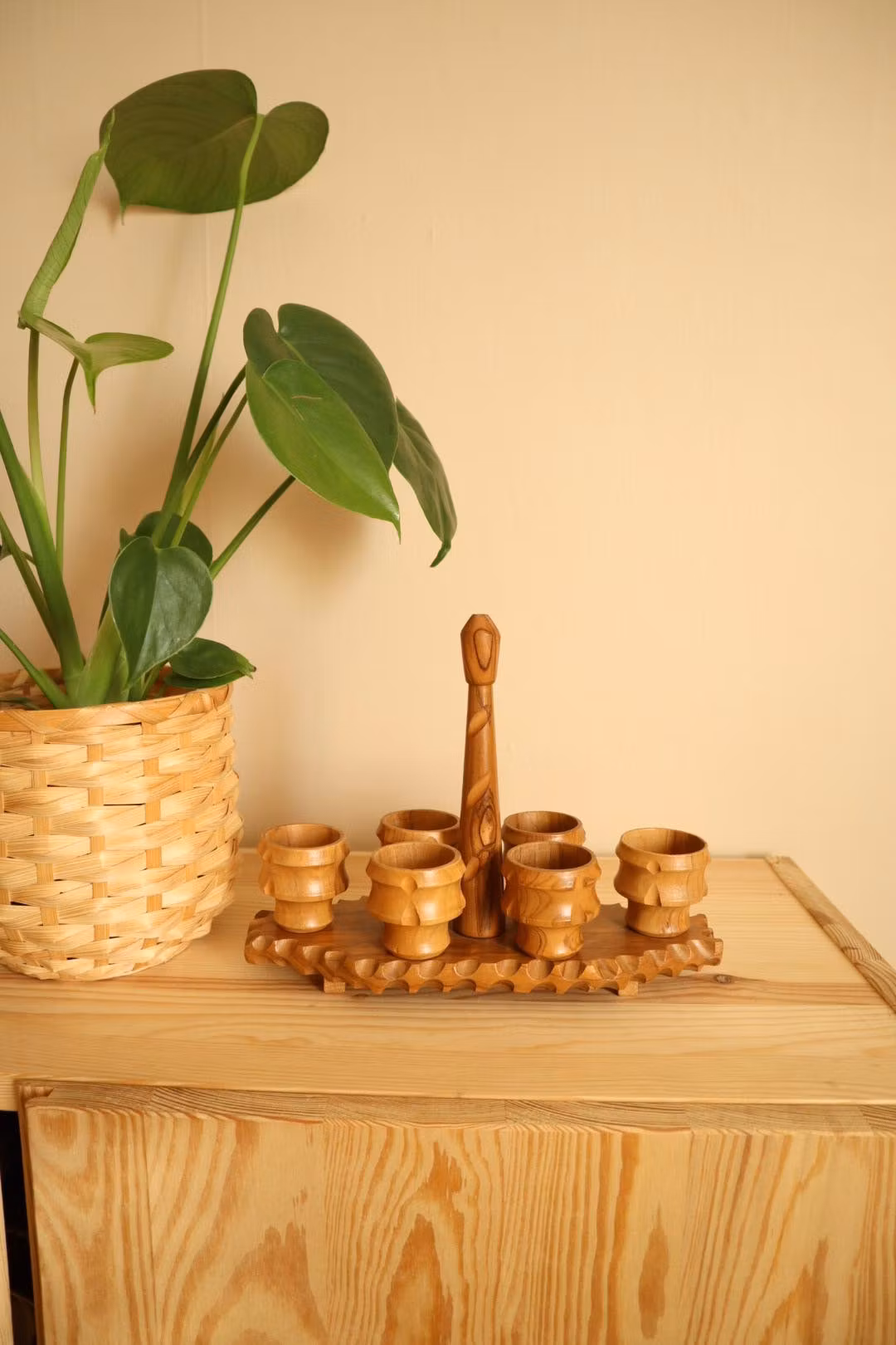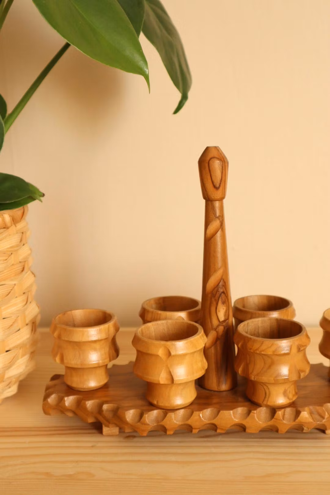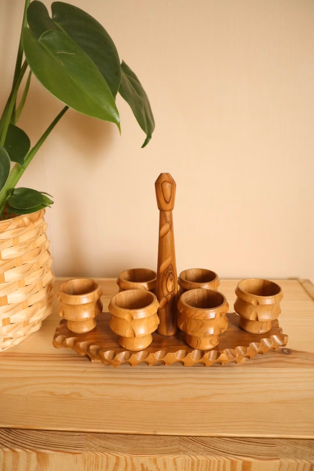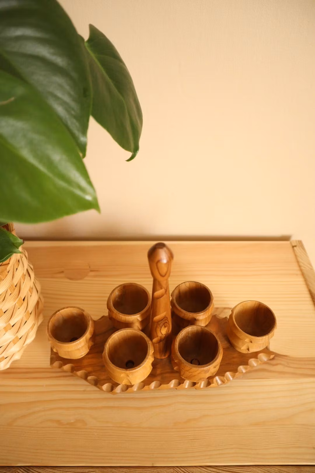 Sex äggkoppar i trä på hållare