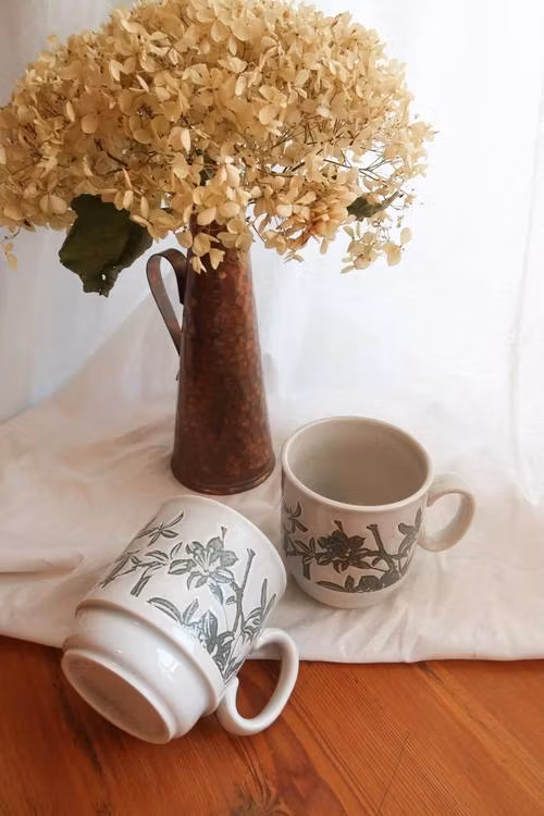 Sex muggar med grönt mönster. Säljs i set om sex.