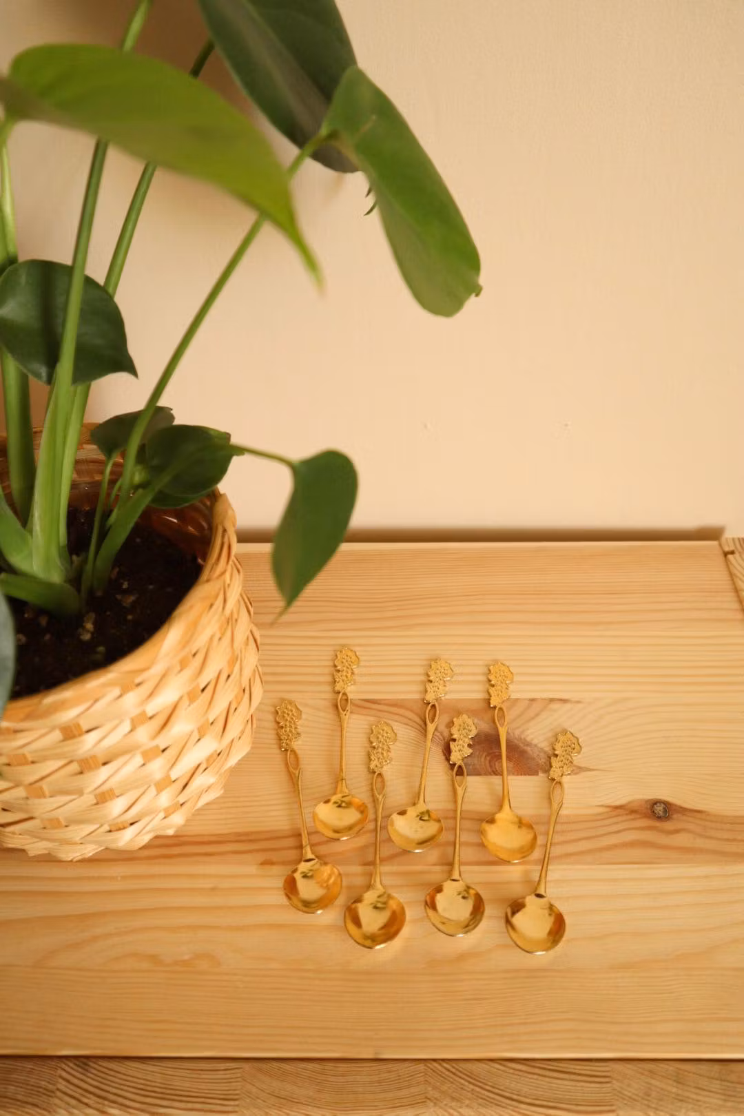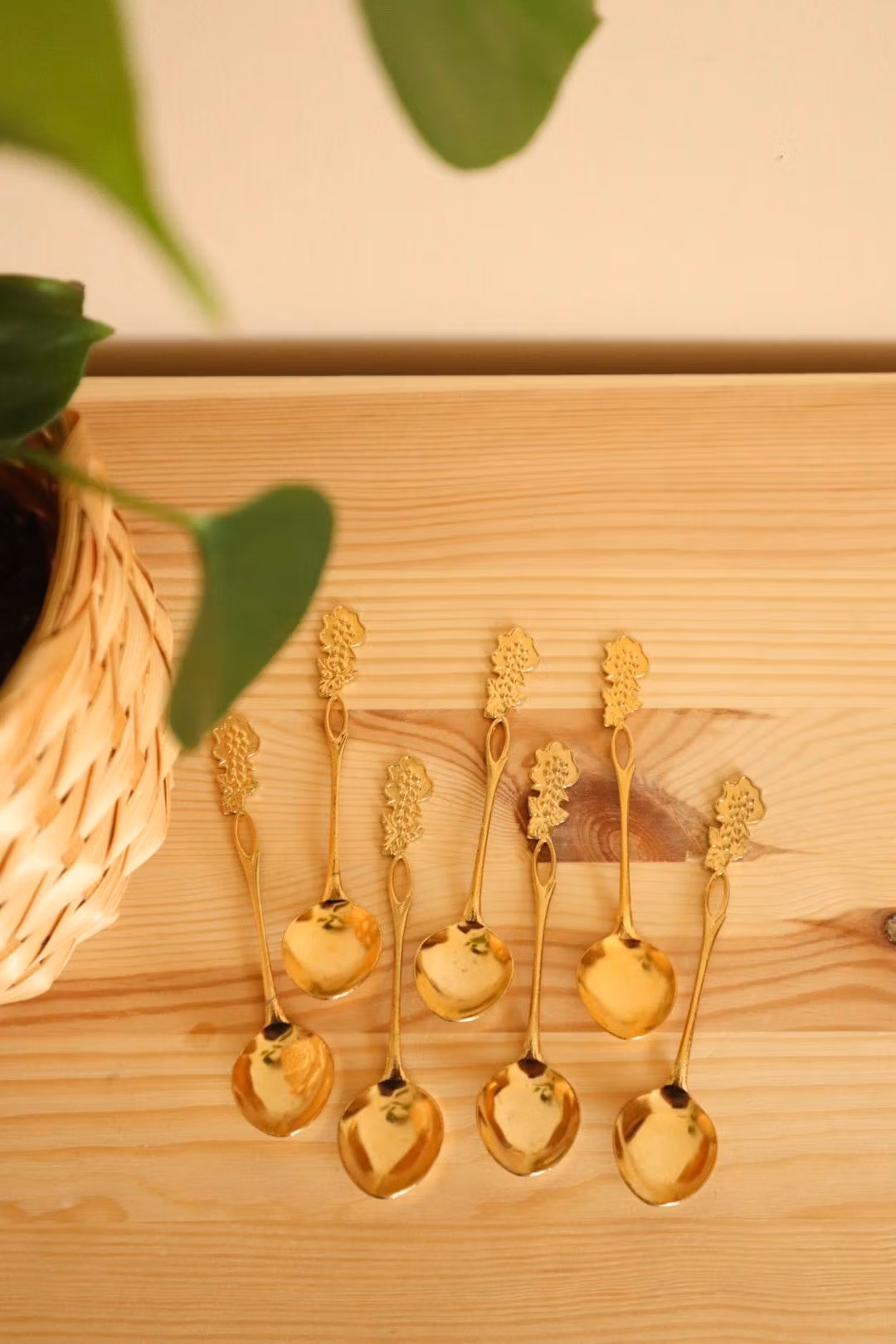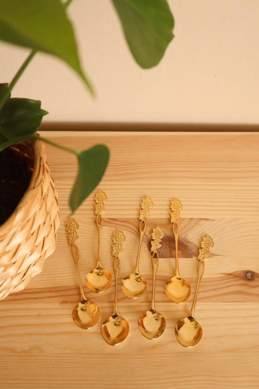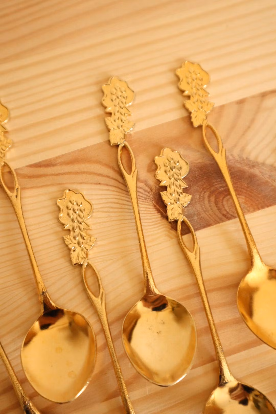 Sju guldfärgade skedar med vindruvor
