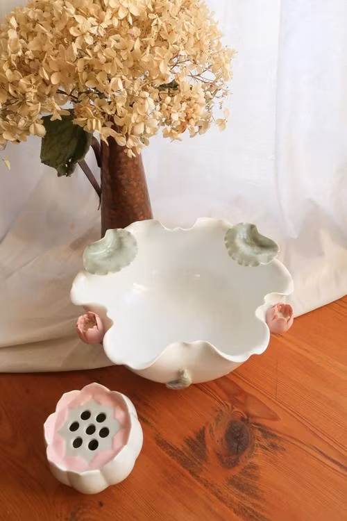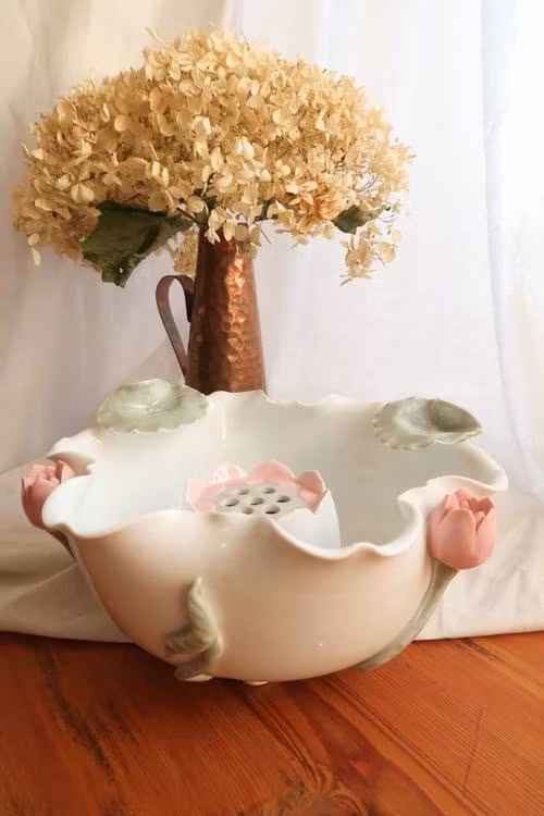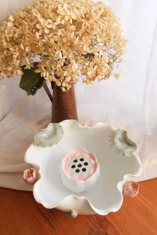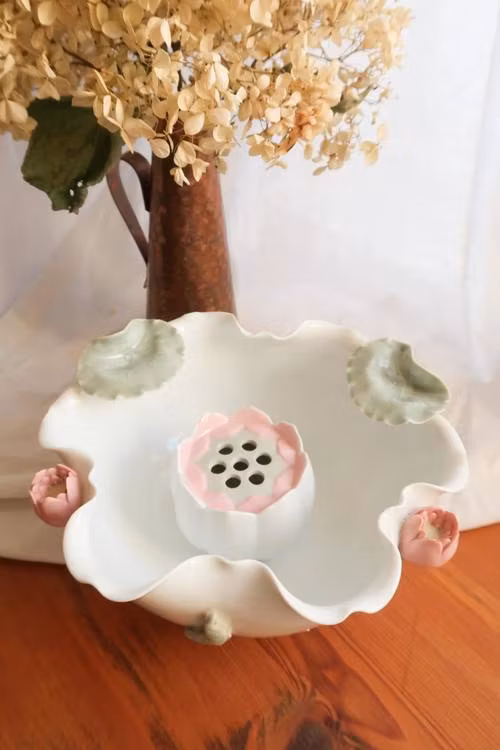Vit skål med näckrosor & en blomsterfakir som går att ta ur.