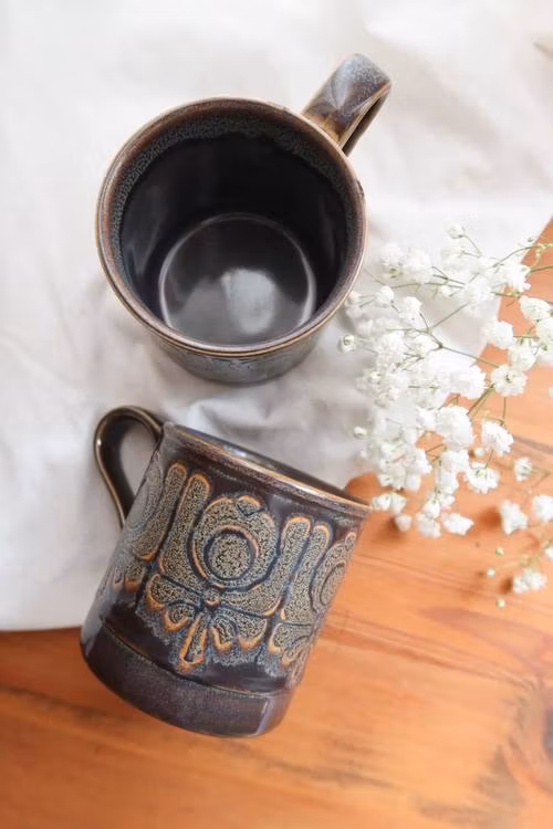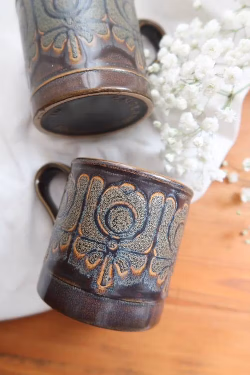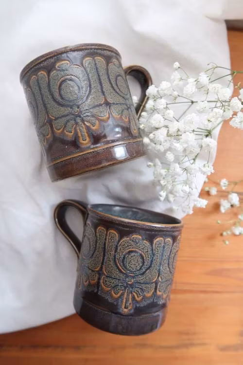 Två blå/bruna retro muggar.