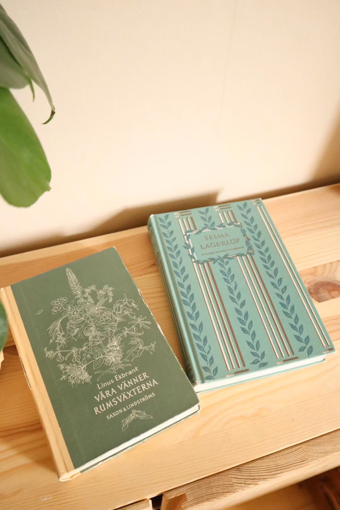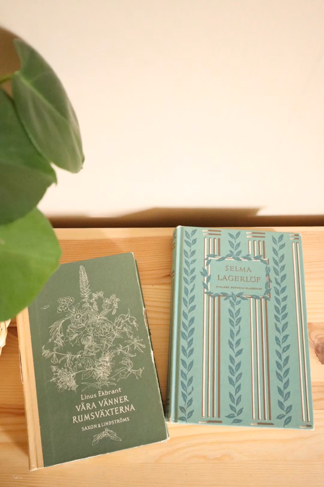 Två gamla böcker med patina som är fina att ha som dekoration.