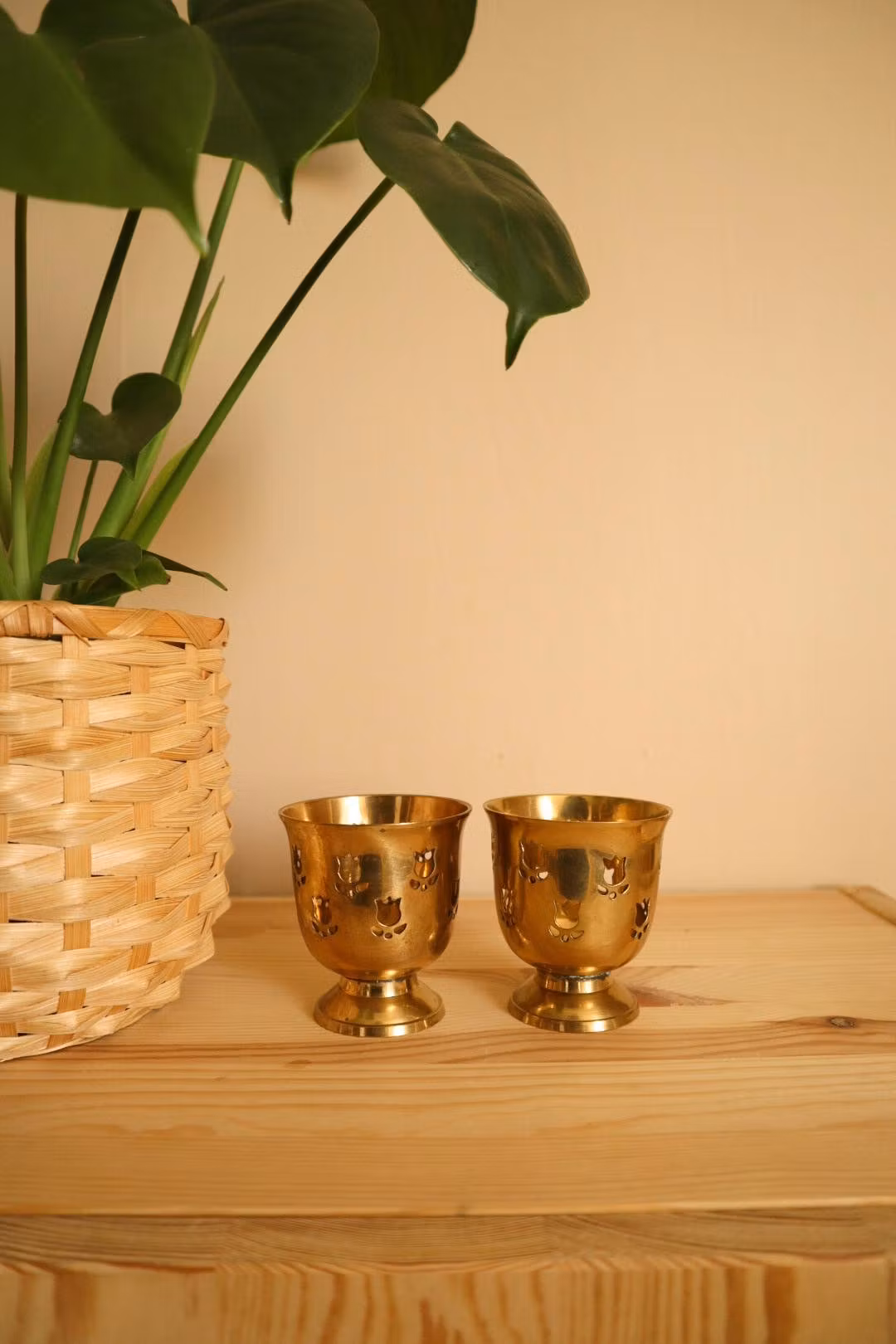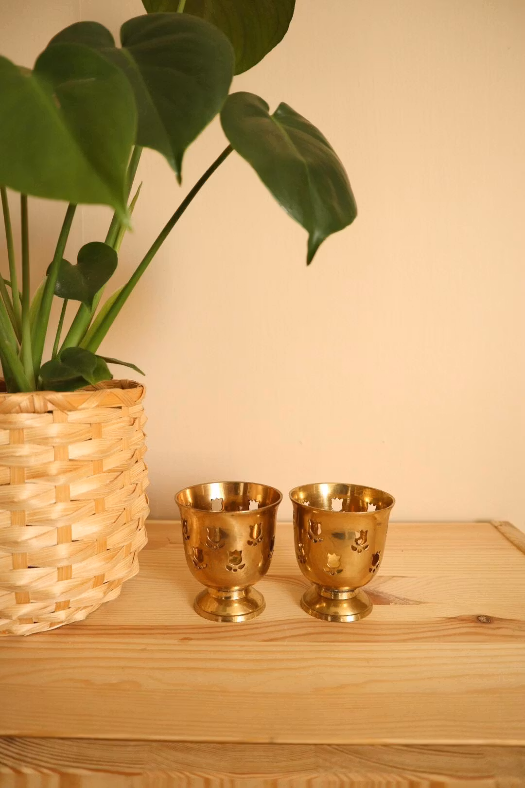 Två mässingljusstakar med tulpaner